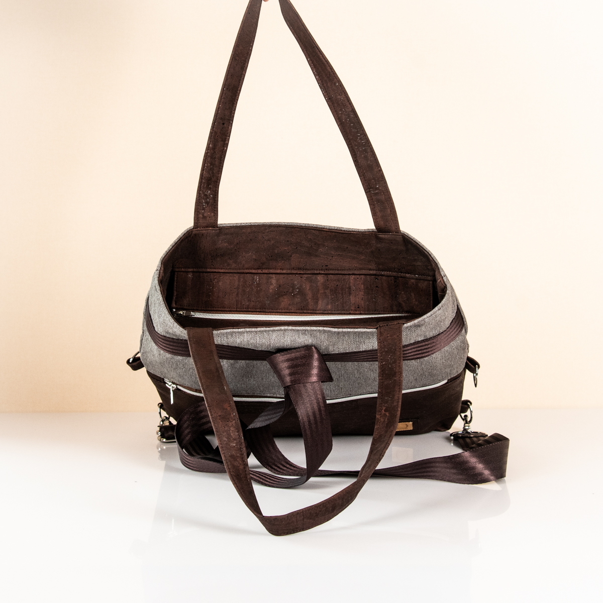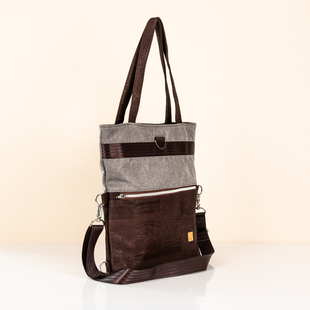 Unglaublich viel Platz bietet die handgefertigte 3in1 Tasche Carli aus Kork und robustem Taschenstoff. Neben der geräumigen Haupttasche gibt es 2 Steckfächer innen und ein großzügiges Reißverschlussfach außen, also jede Menge Stauraum für ausgedehnte Shoppingtouren und Marktbesuche. Auch als Businesstasche ist sie aufgrund ihrer Größe hervorragend geeignet.